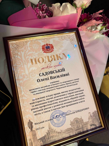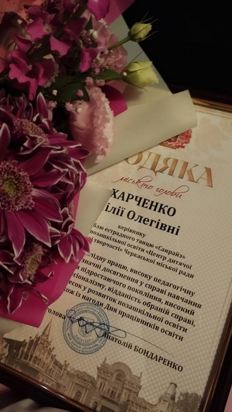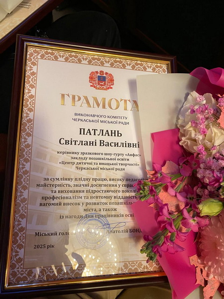 З цієї нагоди за сумлінну й плідну працю, високу педагогічну майстерність, значні досягнення у справі навчання та виховання підростаючого покоління, професіоналізм та невтомну відданість справі, вагомий особистий внесок у розвиток позашкільної освіти міста та з нагоди Дня працівників освіти було відзначено грамотою виконавчого комітету Черкаської міської ради керівницю Зразкового шоу-гурту «Анфас» закладу позашкільної освіти «Центр дитячої та юнацької творчості»