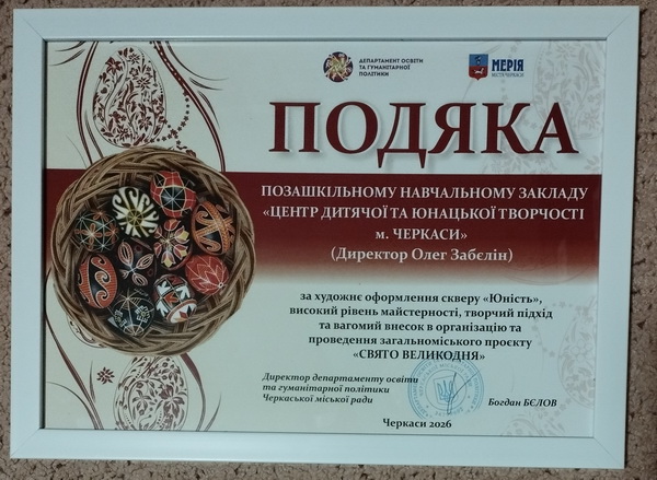 Вже стало гарною традицією , напередодні Великодніх свят прикрашати сквер "Юність". Відділ декоративно-прикладної творчості ЦДЮТ також долучився до цієї справи . Тож, за творчий підхід та вагомий внесок в організацію та проведення загальноміського проєкту "СВЯТО ВЕЛИКОДНЯ" маємо Подяку від Департаменту освіти та гуманітарної політики. Приємно, коли старання цінують!