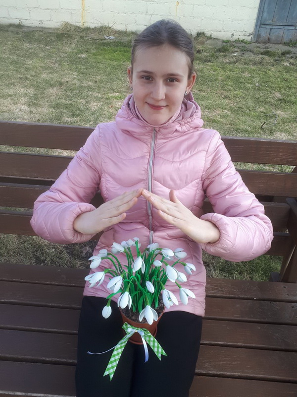Щербатюк Маргарита (14 років) зі своєю чудовою роботою "Маленький підсніжник вітає весну" в номінації "Весняна композиція", техніка виконання "Плетіння гачком".