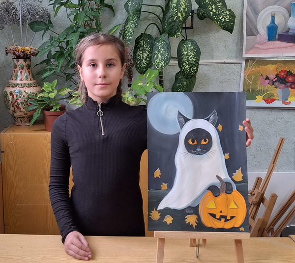 Поліщук Анастасія зі своєю роботою "Мій вірний друже". Автопортрет. Живопис.