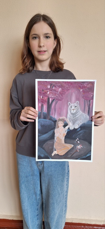 Учасниця конкурсу : Черевко Ніка з роботою "Тендітні підсніжники " в номінації "Кращий малюнок" (живопис)