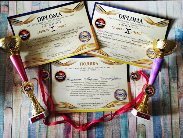 Дві найвищі нагороди ! Два Гран-прі за колекції "Вальс квітів" та "Стильні цукерки"! Кубки Гран-Прі , дипломи, подяки, медалі та подарунки! Такий фестивальний трофей наших учасниць!