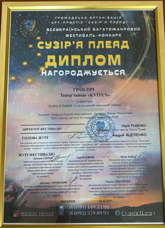 Гран прі отримав колектив за високий рівень виконавської майстерності у категорії стилізована народна хореографія