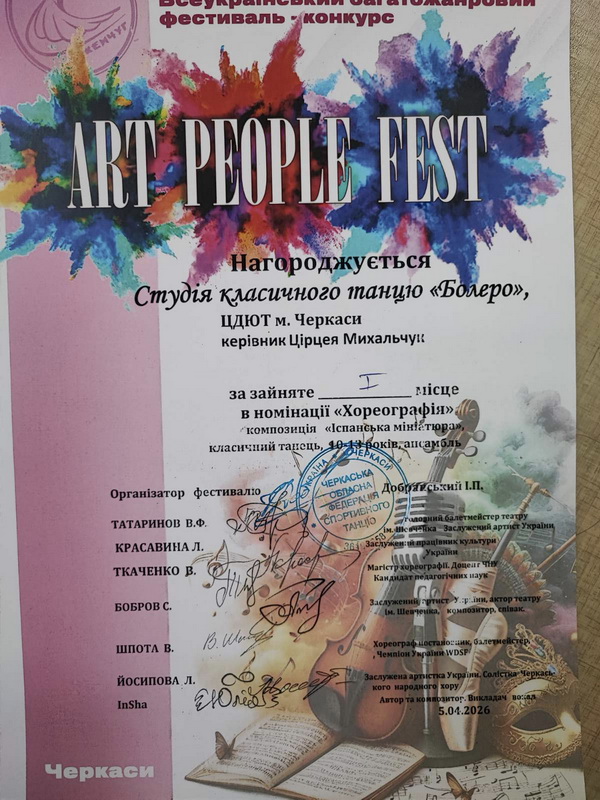 5 квітня Черкаська обласна філармонія перетворилася на центр мистецького драйву. Наші вихованці Центру дитячої та юнацької творчості гідно представили заклад на Всеукраїнському багатожанровому фестивалі «Art People Fest» та повернулися з неймовірним оберемком нагород!