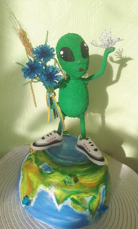 Надзвичайно цікава робота вихованки Студії бісероплетіння "Фантазія" (ЗПО "Центр дитячої та юнацької творчості" ЧМР) Бублей Віталіни під назвою "Миру твоїй планеті,щастя твоїй землі!",привертає увагу оригінальністю композиції та вкладеним змістом.Адже тема миру надзвичайно актуальна для усіх без винятку мешканців планети Земля.В уяві авторки роботи,темою миру переймаються навіть представники позаземних цивілізацій.Для нас найважливішим є мир в Україні,тому прибулець на ім'я Алік(від англійського слова Alien(що в перекладі означає прибулець))бажає миру Україні,тримаючи в одній руці букет волошок з колосками,які символізують життя, добробут, процвітання, силу і стійкість, перев'язаний стрічкою кольорів національного прапора України.Водночас,в іншій руці прибульця розташований голуб миру,готовий до злету-символ прагнення до свободи,подолання усіх перешкод на шляху до миру,уособлення сили духу та здійснення мрій.Птах готовий облетіти усю планету,та принести мир у кожну державу світу.Постамент,на якому розміщується головний герой композиції,зроблений у вигляді глобуса,що підкреслює важливість заклику до миру в усьому світі.