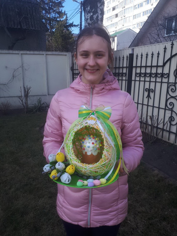 Учасниці Бублей Віталіна з роботою "Великдень в родинному колі" та Будякова Аліана , «Колиска Життя» — яйце як першооснова всесвіту («світове яйце»), що спочиває в лоні природи (моделювання з фоамірану,синельного дроту, бісероплетіння).