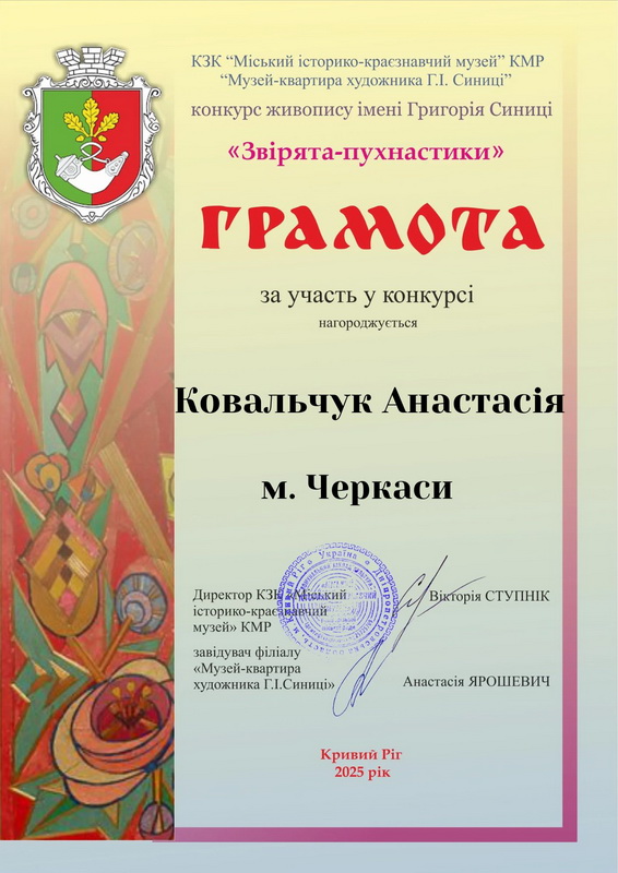 Вітаємо Дядіщеву Анастасію Володимирівну з одержанням почесних дипломів та щиро бажаємо їй здоров'я, великого натхнення, щоб малювалося легко, від душі і усі були у захваті від її творчості.