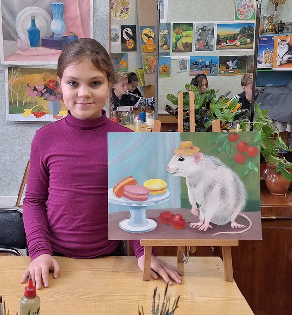 Поліщук Анастасія зі своєю роботою "Мій вірний друже". Автопортрет. Живопис.