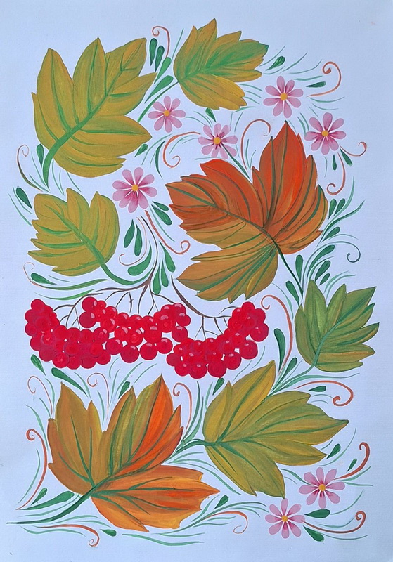 Петриківський розпис Катерини Хижняк ,"Птахи на калині", формат А-3.