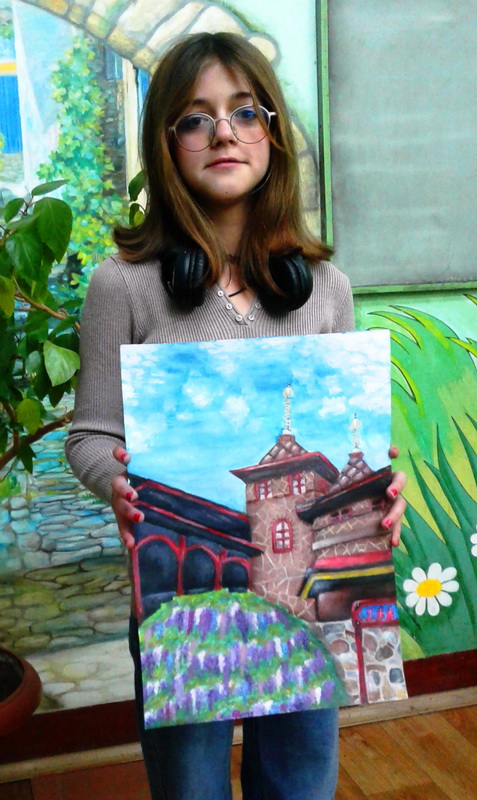 Вдовіченко Ангеліна зі своєю конкурсною роботою "Перші квіти весни" (живопис)