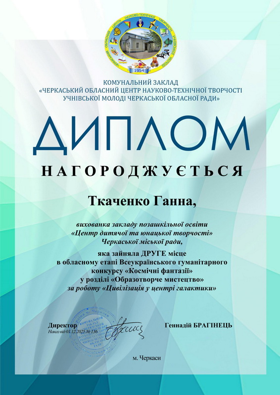 1.Ткаченко Ганна "Цивілізація у центрі галактики"(живопис);