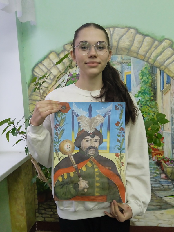 Учасниця конкурсу Попович Маргарита (15 р.) представила роботу "Козацький дух незламності "(живопис, гуаш)