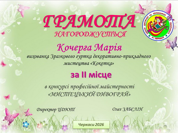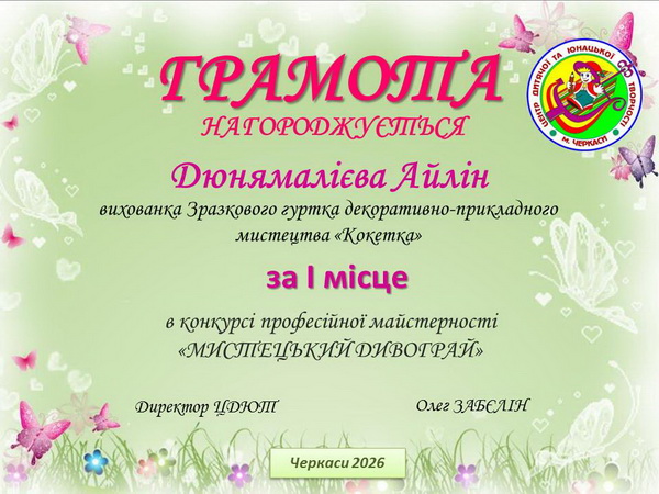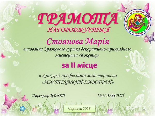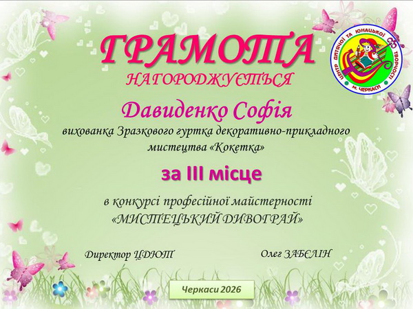 Вітаємо Шавлак Вікторію, вихованку Зразкового гуртка декоративно-прикладного мистецтва «Кокетка» (керівник Сорока Марина Миколаївна), за здобуте ІІІ місце в обласній виставці-конкурсі декоративно – ужиткового і образотворчого мистецтва «Знай і люби свій край» у номінації «Витинання» за роботу «Українські мотиви».