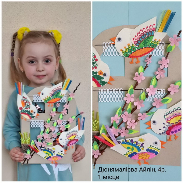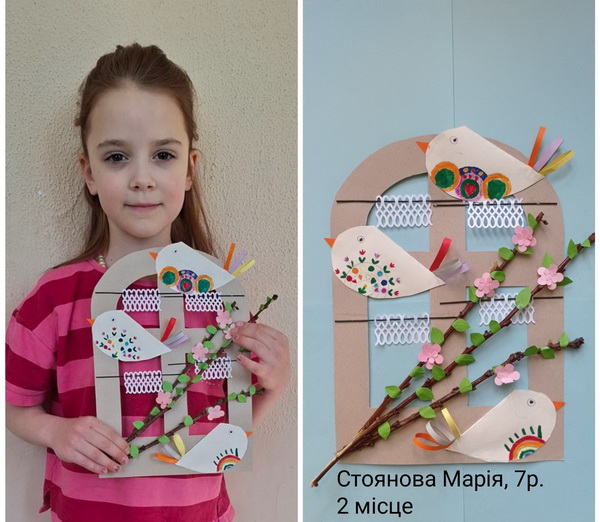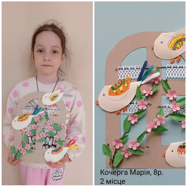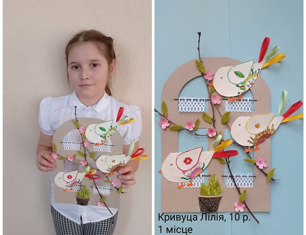 Учасниця обласного конкурсу "Українська великодня писанка" та міського конкурсу "Великодня Україна" -2026 Білоус Вікторія з роботами "Писанка" (ізонитка) та "Великодній кошик" (декупаж, колаж)